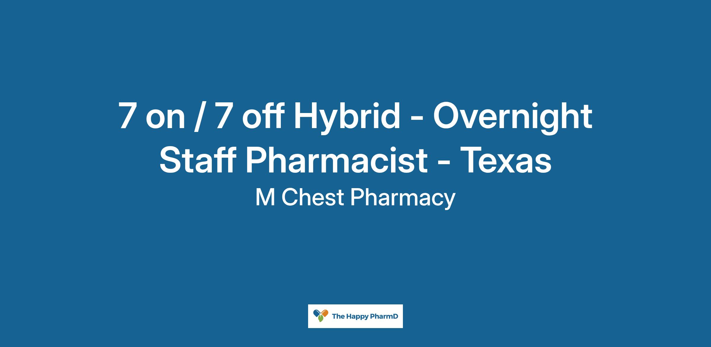 - Be able to work the 7 on and 7 off shift that includes nights and weekends. This position may require work outside regular scheduled hours dependent on pharmacy needs.