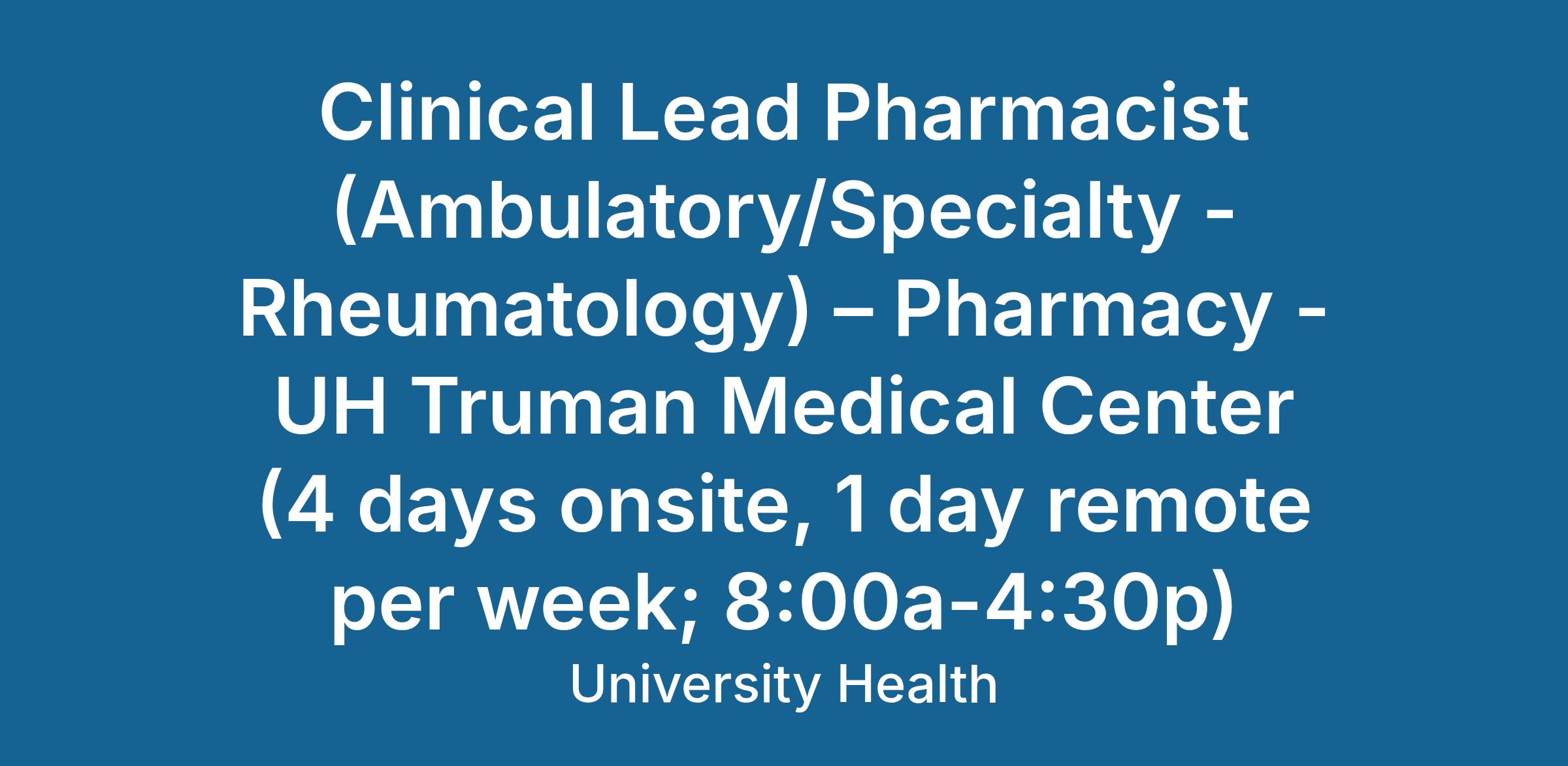 Clinical Lead Pharmacist (Ambulatory/Specialty - Rheumatology) – Pharmacy - UH Truman Medical Center (4 days onsite, 1 day remote per week; 8:00a-4:30p)101 Truman Medical CenterClinical Lead Pharmacist (Ambulatory/Specialty - Rheumatology)