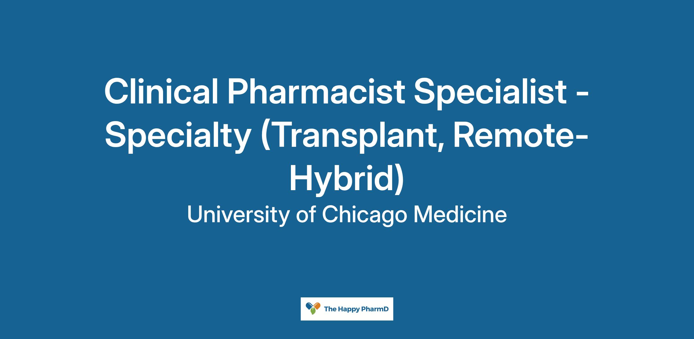 Be a part of a world-class academic healthcare system, UChicago Medicine, as a Clinical Pharmacist Specialist, Transplant in the Specialty Pharmacy. As a Clinical Pharmacist Specialist, you will be a registered pharmacist who assumes responsibility and accountability for the provision of safe, effective, and prompt medication therapy. UCM Specialty Pharmacy supports and provides direct patient care to adult and pediatric populations and works alongside world-renowned providers. Our pharmacists cover pharmacy operations and clinical needs for 15+ specialty ambulatory clinics. This position is designed to support transplant transitions of care upon discharge from transplantation hospital stay along with ongoing transplant specialty medication responsibilities. Transplant and Medicare Part B experience is preferred. This position also supports other clinics in Specialty, which can include Oncology, Neurology, HIV, Transplant, Rheumatology, and Gastroenterology. Pharmacist responsibilities include clinical and operational tasks to support specialty pharmacy and provider needs. Pharmacists will rotate on-site through the Hyde Park campus or alternate locations. This position will be in transplant clinic 3 days per week in Hyde Park and work from home the other 2 days of the week. They will also participate in an overall full week rotation (Monday through Friday) with other pharmacists in Specialty Pharmacy, approximately 1 week every 12 week schedule. This is subject to change. UCM Specialty Pharmacy team is highly dedicated to ensuring all patients achieve the most benefit from their medical therapy.