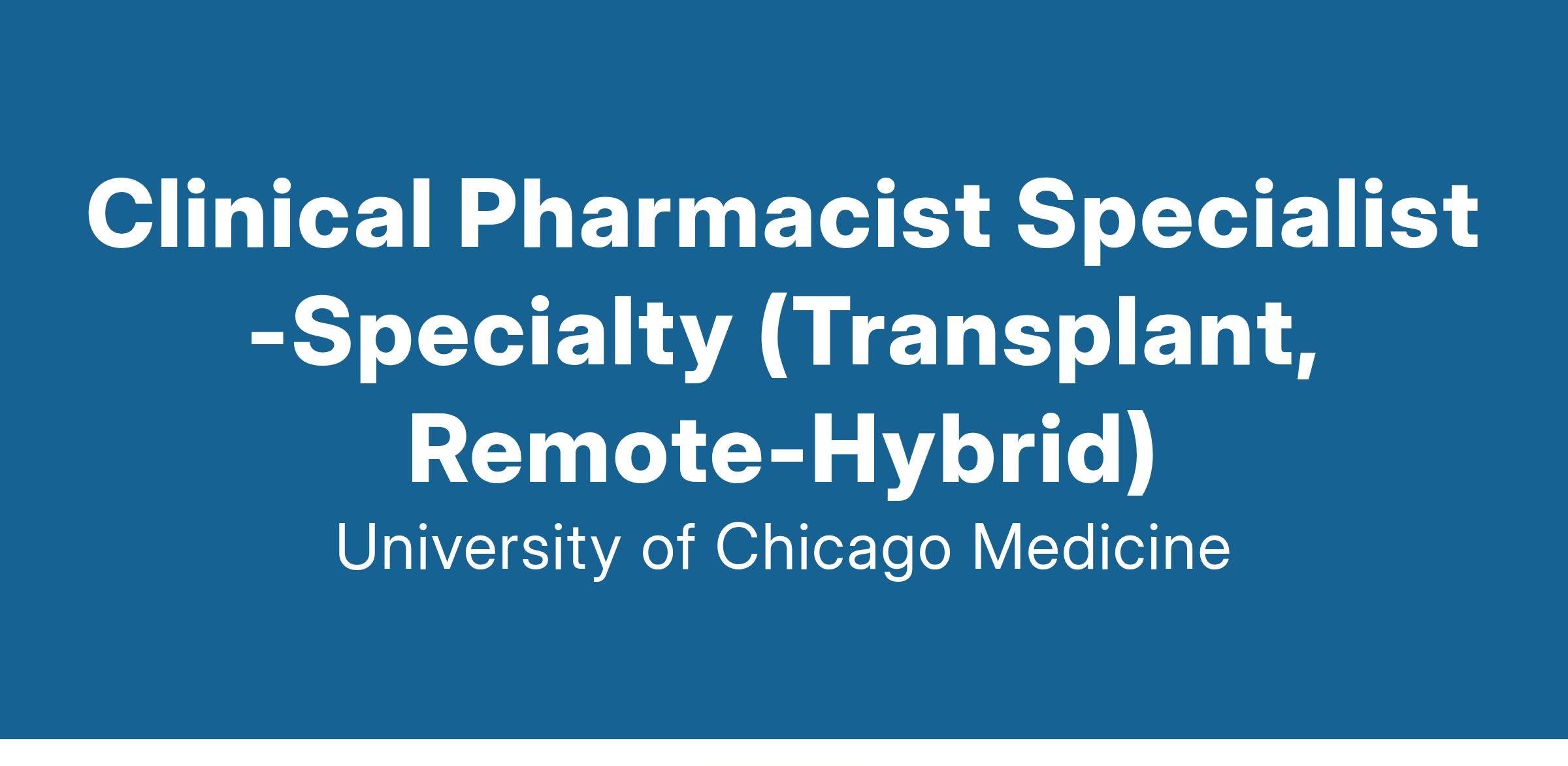 Be a part of a world-class academic healthcare system, UChicago Medicine, as a Clinical Pharmacist Specialist, Transplant in the Specialty Pharmacy. As a Clinical Pharmacist Specialist, you will be a registered pharmacist who assumes responsibility and accountability for the provision of safe, effective, and prompt medication therapy. UCM Specialty Pharmacy supports and provides direct patient care to adult and pediatric populations and works alongside world-renowned providers. Our pharmacists cover pharmacy operations and clinical needs for 15+ specialty ambulatory clinics. This position is designed to support transplant transitions of care upon discharge from transplantation hospital stay along with ongoing transplant specialty medication responsibilities. Transplant and Medicare Part B experience is preferred. This position also supports other clinics in Specialty, which can include Oncology, Neurology, HIV, Transplant, Rheumatology, and Gastroenterology. Pharmacist responsibilities include clinical and operational tasks to support specialty pharmacy and provider needs. Pharmacists will rotate on-site through the Hyde Park campus or alternate locations. This position will be in transplant clinic 3 days per week in Hyde Park and work from home the other 2 days of the week. They will also participate in an overall full week rotation (Monday through Friday) with other pharmacists in Specialty Pharmacy, approximately 1 week every 12 week schedule. This is subject to change. UCM Specialty Pharmacy team is highly dedicated to ensuring all patients achieve the most benefit from their medical therapy.