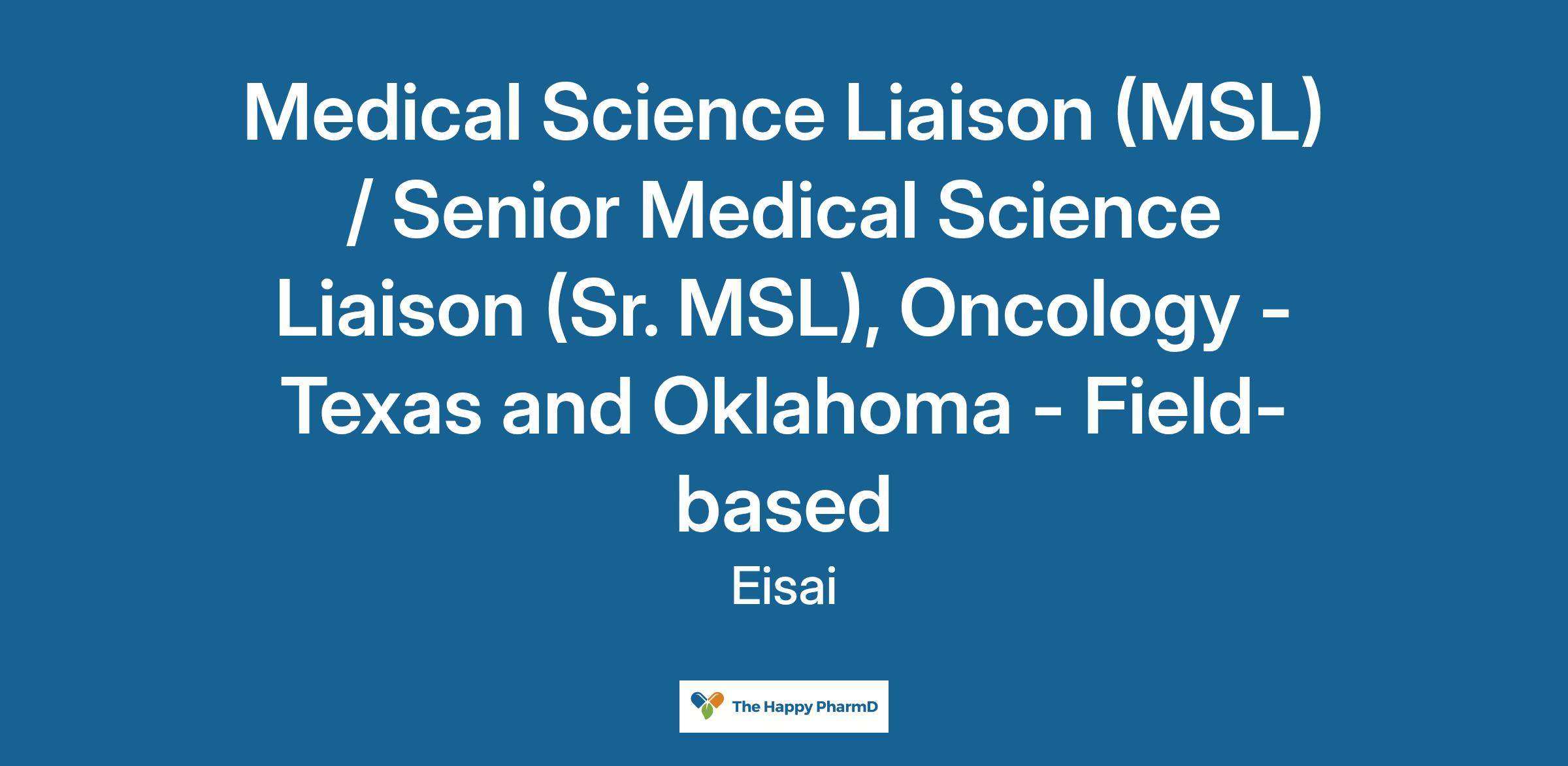 The annual base salary range for the Medical Science Liaison (MSL) / Senior Medical Science Liaison (Sr. MSL), Oncology - Texas and Oklahoma - Field-based is from :$160,100-$210,100Under current guidelines, this position is eligible to participate in : Eisai Inc. Annual Incentive Plan & Eisai Inc. Long Term Incentive Plan.Final pay determinations will depend on various factors including but not limited to experience level, education, knowledge, and skills.