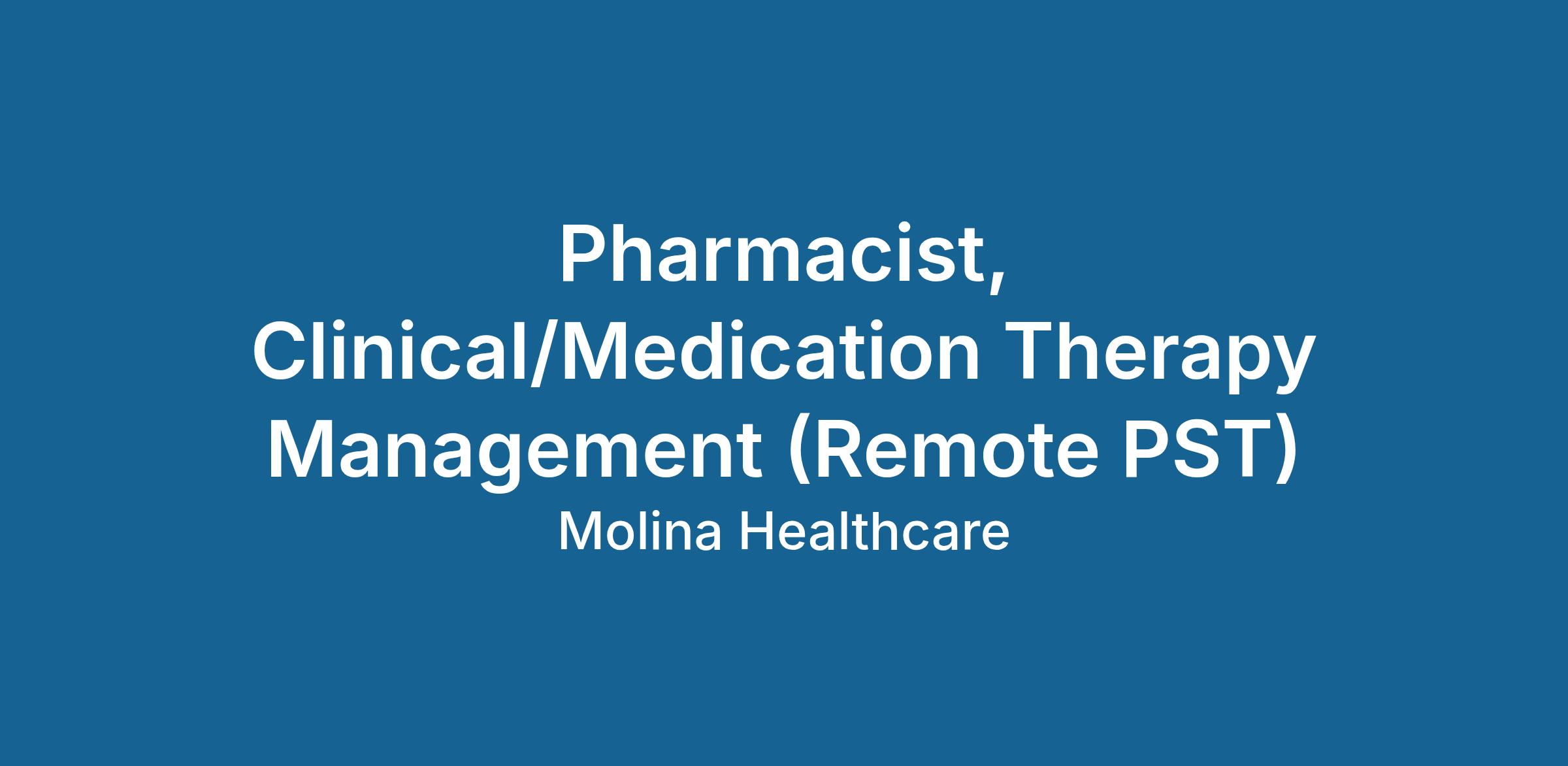 DescriptionMolina Healthcare is hiring 4 Remote Pharmacists to support our Medication Therapy Management (MTM) and clinical pharmacy services activities. This role contributes to overarching pharmacy strategy for optimization of medication related health care outcomes, and quality cost-effective member care.